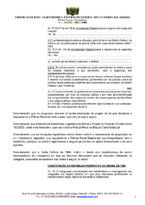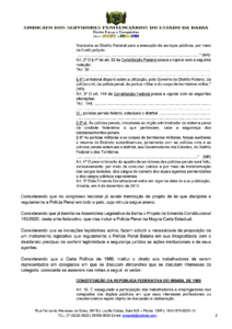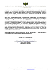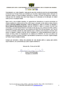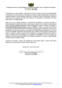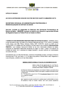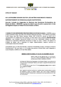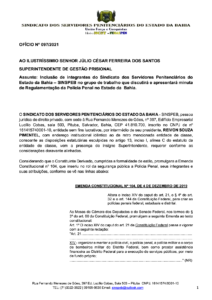 Diante da garantia deste direito citado acima, o Presidente do Sindicato dos Servidores da Polícia Penal do Estado da Bahia-SINSPPEB, Reivon Pimentel, protocolou ontem (13.04.21), ofícios, solicitando ao Secretário de Administração Penitenciária e Ressocialização do Estado da Bahia, Senhor Nestor Duarte, como também ao Superintendente de Ressocialização Sustentável, Senhor Luís Antônio Nascimento Fonseca e ao Superintendente de Gestão Prisional, Senhor Júlio César Ferreira dos Santos, a inclusão de integrantes do SINSPPEB no grupo de trabalho que discutirá e apresentará a Minuta de Regulamentação da Polícia Penal no Estado da Bahia.