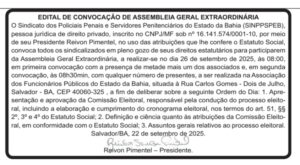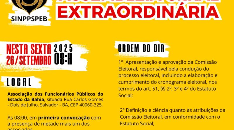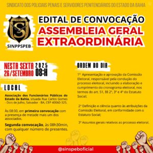 É com grande responsabilidade que convocamos todos os sindicalizados a estarem presentes na Assembleia Geral Extraordinária, a ser realizada no dia 26 de setembro de 2025, às 08h em primeira convocação, e às 08h30min em segunda convocação, na Associação dos Funcionários Públicos do Estado da Bahia, localizada na Rua Carlos Gomes – Dois de Julho, Salvador/BA.