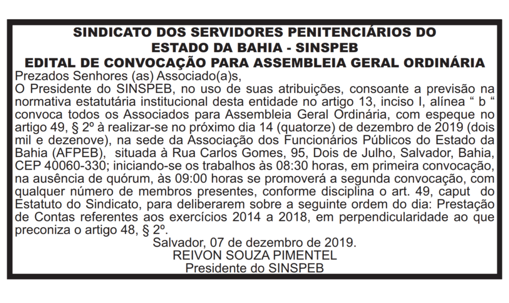 O Presidente do Sindicato dos Servidores Penitenciários do Estado da Bahia (SINSPEB), Reivon Pimentel, no uso de suas atribuições estatutárias, convoca todos os Associados para a Assembleia Geral Ordinária, a ser realizada no próximo sábado (14/12), no auditório da Associação dos Funcionários Públicos do Estado da Bahia (AFPEB), às 08:30hs.